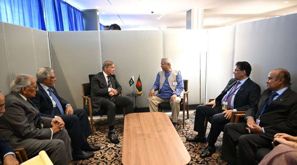 اقوام متحدہ کی جنرل اسمبلی کے 80ویں اجلاس کے موقع پر وزیراعظم پاکستان محمد شہباز شریف اور بنگلا دیش کے چیف ایڈوائزر پروفیسر محمد یونس کے درمیان سائیڈ لائن پر ایک اہم ملاقات ہوئی۔ یہ ملاقات نہایت خوشگوار اور دوستانہ ماحول میں انجام پائی۔ ملاقات میں دونوں رہنماؤں نے پاکستان اور بنگلا دیش کے تعلقات کو مزید مضبوط اور فعال بنانے پر تبادلہ خیال کیا۔ اس موقع پر تجارت، علاقائی تعاون، ثقافتی روابط اور عوامی سطح پر تعلقات کو فروغ دینے جیسے پہلوؤں پر خصوصی بات چیت کی گئی۔