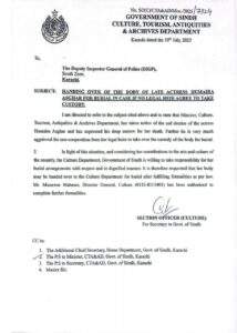 سیکریٹری ثقافت کی جانب سے ڈی آئی جی ایسٹ کو باقاعدہ خط ارسال کیا گیا، جس میں صاف الفاظ میں تحریر کیا گیا کہ ”مرحومہ حمیرا اصغر لاوارث نہیں، سندھ حکومت ان کی وارث ہے“۔ خط میں یہ بھی واضح کیا گیا کہ تدفین سے لے کر قبرستان میں سپرد خاک کیے جانے تک تمام مراحل محکمہ ثقافت کی ذمے داری ہوں گے۔ سید ذوالفقار علی شاہ نے اپنے بیان میں کہا: