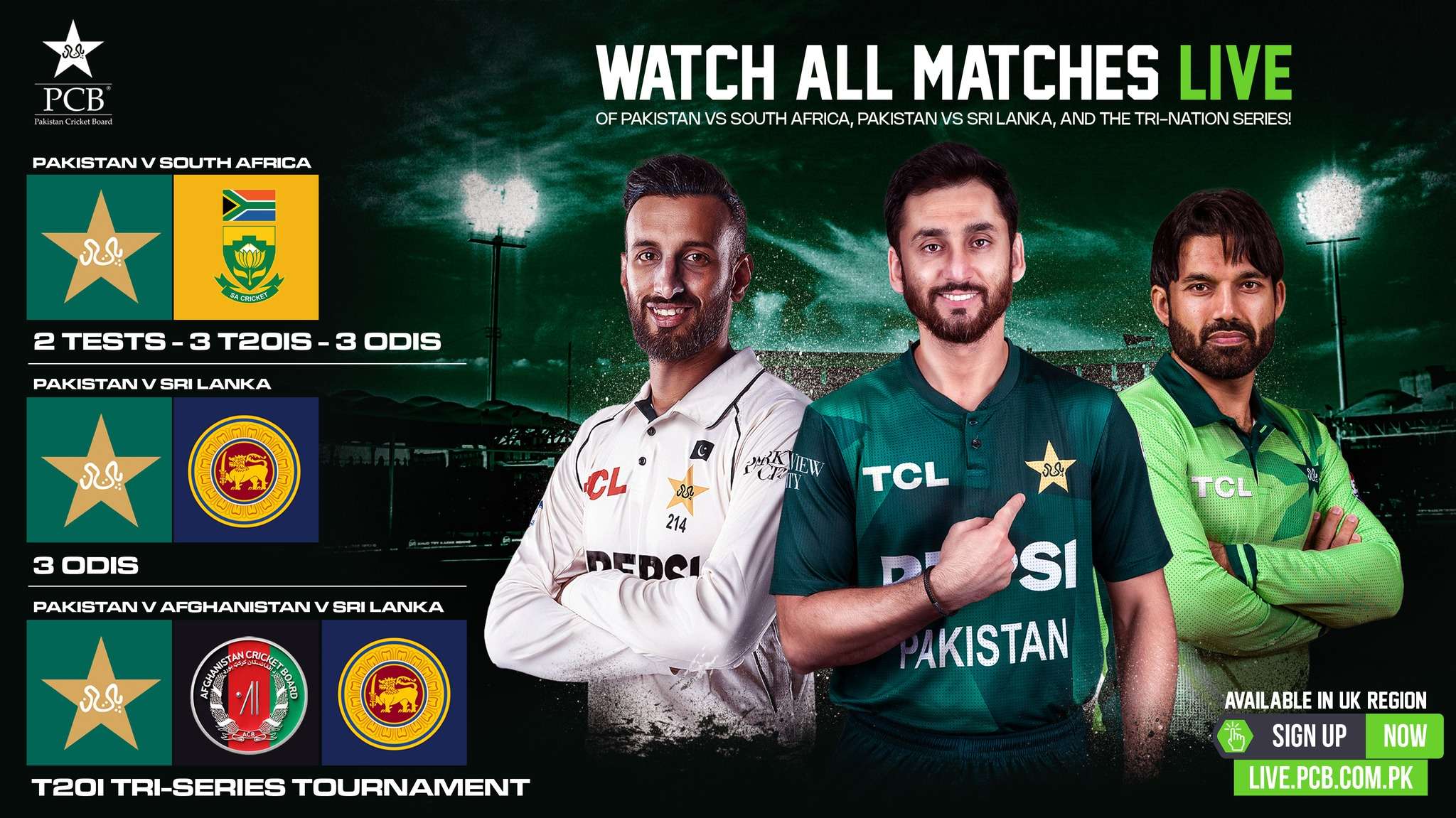 ترجمان پی سی بی کے مطابق، “پی سی بی لائیو” فی الحال برطانیہ میں آزمائشی بنیادوں پر ویب سروس کی صورت میں دستیاب ہے۔ برطانوی شائقین live.pcb.com.pk پر رجسٹریشن کے بعد پاکستان بمقابلہ جنوبی افریقہ سیریز کے تمام میچز براہِ راست دیکھ سکیں گے۔