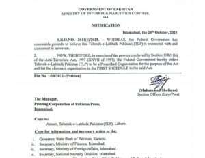 وفاقی حکومت نے تحریک لبیک پاکستان (ٹی ایل پی) کو باقاعدہ طور پر کالعدم تنظیم قرار دیتے ہوئے نوٹیفکیشن جاری کر دیا ہے۔ وزارتِ داخلہ کے اعلامیے میں کہا گیا ہے کہ حکومت کے نزدیک ٹی ایل پی دہشت گردی میں ملوث پائی گئی ہے، لہٰذا اسے انسدادِ دہشتگردی ایکٹ کے تحت پابندی کی فہرست میں شامل کیا جا رہا ہے۔ اس سے قبل وزیراعظم شہباز شریف کی زیرصدارت وفاقی کابینہ کے اجلاس میں تنظیم پر پابندی کی منظوری دی گئی۔ اجلاس میں بتایا گیا کہ 2016 میں قائم ہونے والی ٹی ایل پی ملک بھر میں پُرتشدد احتجاجی مظاہروں اور شرانگیزی کی کارروائیوں میں ملوث رہی ہے، جن کے نتیجے میں سیکیورٹی اہلکاروں اور عام شہریوں کی قیمتی جانیں ضائع ہوئیں۔