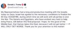 "میرے نمائندوں نے آج غزہ کے حوالے سے اسرائیلی حکام کے ساتھ ایک طویل اور نتیجہ خیز ملاقات کی، جس میں اسرائیل نے 60 روزہ جنگ بندی کو حتمی شکل دینے کے لیے درکار شرائط سے اتفاق کر لیا ہے۔ اس مدت کے دوران ہم تمام فریقین کے ساتھ مل کر جنگ کے خاتمے کے لیے کام کریں گے۔”